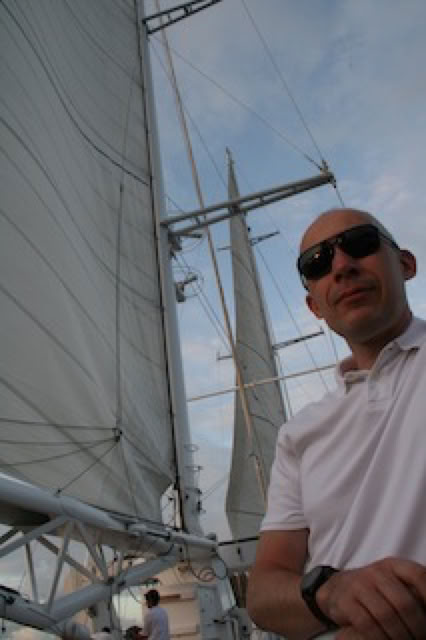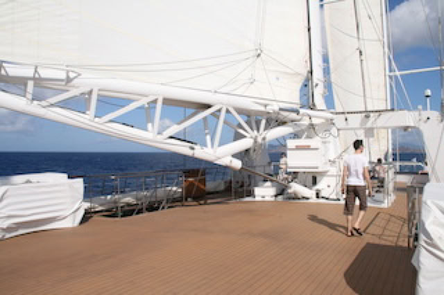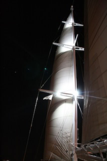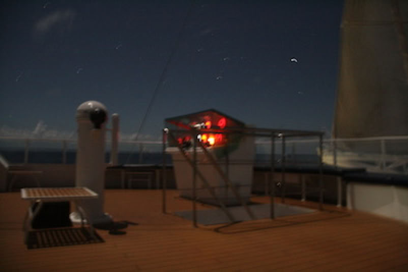 Je traîne un peu sur le pont supérieur pour regarder la lune et les étoiles danser autour des mâts: c'est un spectacle un étonnant de voir ainsi les étoiles monter et descendre au rythme du balancement du voilier. À ce moment là, les moteurs sont au ralenti et le bateau n'avance qu'à quelques nœuds à la voile ... sur des airs d'opéra diffusés par les hauts parleur sur ce pont.
