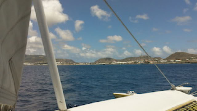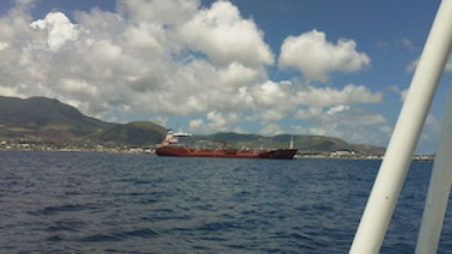Déjeuner façon barbecue au restaurant Diamant: il fait bien chaud et la glace au dessert est bienvenue. Le Ponant appareille à 14h : on croise un énorme car-carrier. Le vent est très faible et le Ponant se traîne, le vent de l'Atlantique étant en partie bloqué par l'île de Nevis. Puis farniente une bonne partie de l'aprés-midi.