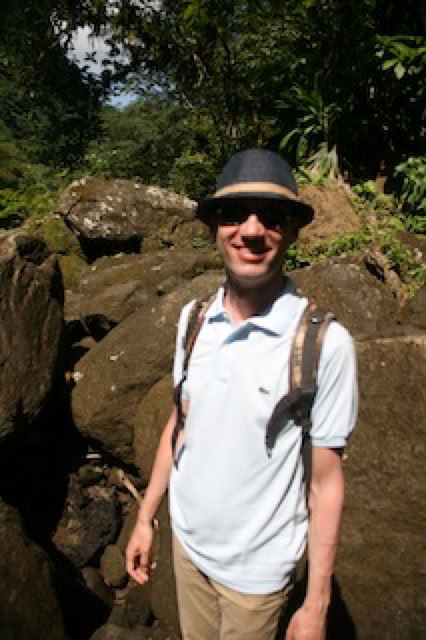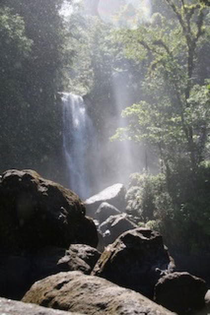Ensuite excursion aux chutes de Trafalgar: pour y arriver, le minibus escalade des cotes à plus de 25% avec des panneaux "engage low gear" avant le début de la montée. Le site lui même, très touristique, est joli, mais il faut s'engager sur le petit chemin "at your own risk" pour vraiment arriver dans un endroit superbe, avec les deux chutes, le soleil ... et la pluie ! Paysage tropical de carte postale ! Charles évidemment saute de rocher en rocher comme un cabri !