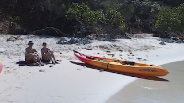 Nous allons poser nos deux canoës au milieu d’un petit lagon : fond blanc, 30 cm d’eau limpide, la mer et les iles autour, le soleil ... Une vraie carte postale.