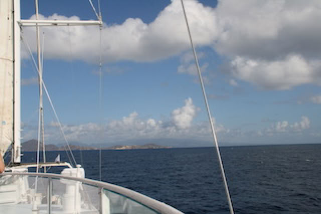 À 13h, repas en plein air au restaurant Diamant, et appareillage pour une navigation jusqu'au lendemain matin. Le ciel est bleu, la mer est d'un bleu profond, les îles au loin s'éloignent et on ne se lasse pas de regarder le sillage du bateau depuis la plage arrière.