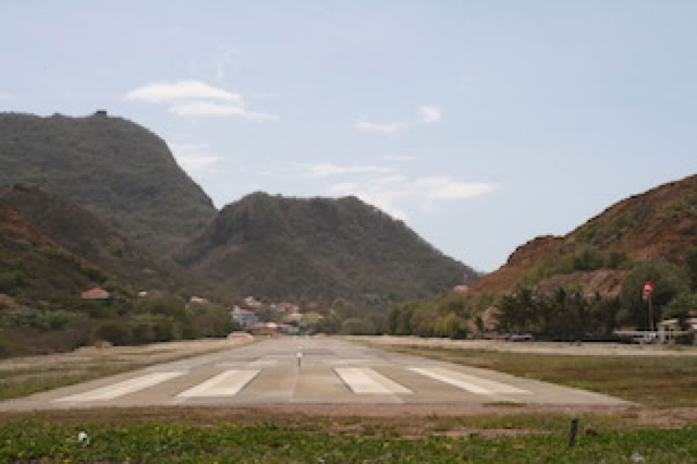 Nous admirons aussi la courte piste de l'aérodrome: l’approche est spectaculaire car les avions doivent survoler la ville à très basse altitude avant de faire un virage pour se jeter sur le seuil de piste entre deux collines. L'autres extrémité donne directement sur la plage. On regarde un Cessna décoller ... et un iguane traverser la route.