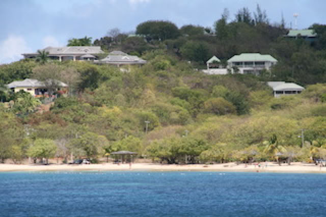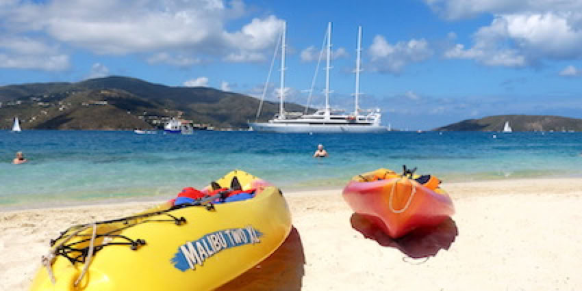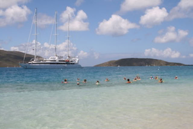 Après le petit-déjeuner en plein-air sur le pont Antigua, tous les passagers sont amenés en zodiac sur la plage de Prickley Pier Island, à 10h. Depuis la plage, on observe le yacht «Party Girl» avec son imposant toboggan qui part du pont supérieur jusqu’à la mer, et son équipage dédié au divertissement des 4 enfants de ce bateau. Dans un autre genre, le yacht «T6» avec son hélipad, et son hélicoptère qui fera plusieurs rotation dans la journée, sans doute pour transporter ses propriétaires ... ou pour faire les courses !