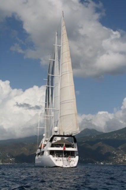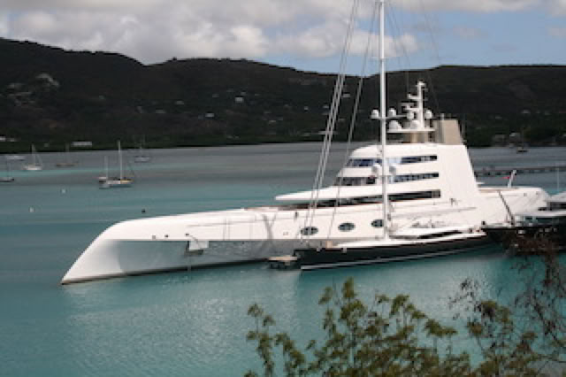 Le bateau est déjà au mouillage dans «Deep Bay», devant l'île d'Antigua, le "Saint Tropez" des Caraïbes. Et effectivement, tout en prenant notre petit déjeuner au restaurant Diamant, nous pouvons admirer de magnifiques yachts dans la baie, en particulier le «A» du jeune millardaire russe Andrey Melnichenko, dessiné par Starck (plus d’info sur http://www.yacht-trend.com/mega-yacht-a-hamilton-design-by-philippe-starck/ )
