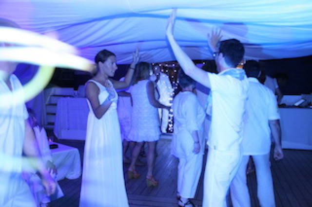 Après le repas, tout le monde descend sur le pont Antigua qui a été entièrement garni de blanc pour une soirée dansante très animée. Pierre est la star du dancefloor, avec Sarah, Mathieu, Charles et Fabienne, jusqu'à minuit. A un moment, tous les hommes se retrouvent même torse-nus : chaud !