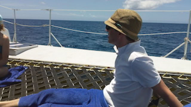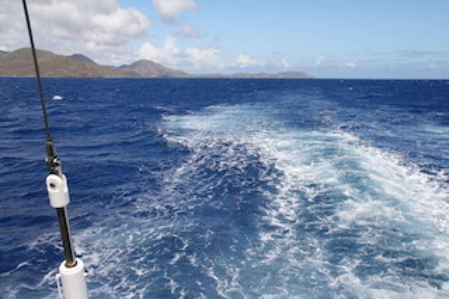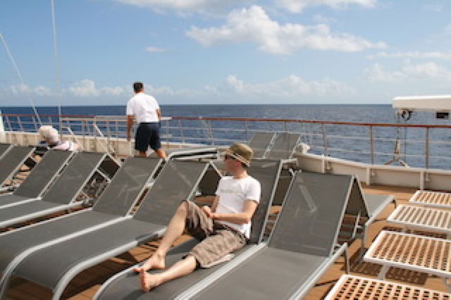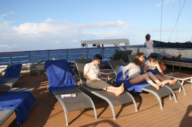 Un membre d'équipage vient poser une longue ligne de traîne : on verra bien si on mangera de l'espadon ! Mais la probabilité est faible. Farniente à l'ombre sur le pont Antigua : c'est bon !
