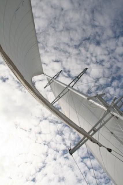 Et là, moment superbe, les 3 gigantesques voiles sont hissées et positionnées, le bateau s'oriente vers la sortie du port et et commence à glisser vers la mer ... juste magique ! Et le commandant de nous rappeler que les voiles ne sont pas là pour faire joli.