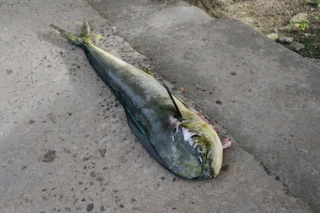 Histoire de terminer sur une note de fraîcheur, baignade sur une toute petite plage, fréquentée aussi par un iguane pas farouche, avant de rejoindre la ville. En revenant, nous croisons une énorme dorade coryphène ramenée par un pécheur. Nous prenons en terrasse un grand verre de jus frais de fruit de la passion comme je n’en ai jamais bu ! Si ce n’étaient les conséquences probables, j’en aurais bien pris un second. Nous sommes face à la jetée, en attendant le dernier Zodiac de 17h30.