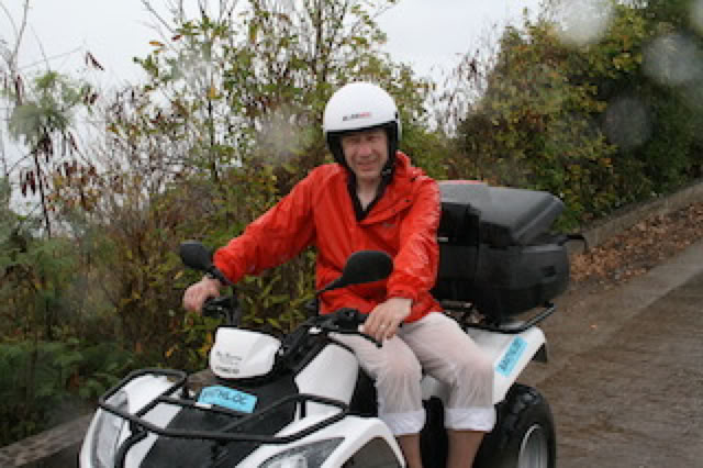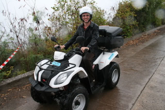 À 14h retour à terre pour l’après-midi ... il pleut toujours de plus belle. Pierre avait réservé un scooter pour nous déplacer sur l’île. La patronne de Barthloc demande si l'on a déjà conduit un scooter: nous sommes deux, il pleut, les routes sont très pentues. Je réponds non et la patronne nous propose alors un quad pour le même prix, finalement plus sur et plus pratique (nos affaires seront à l’abris de la pluie dans le coffre).