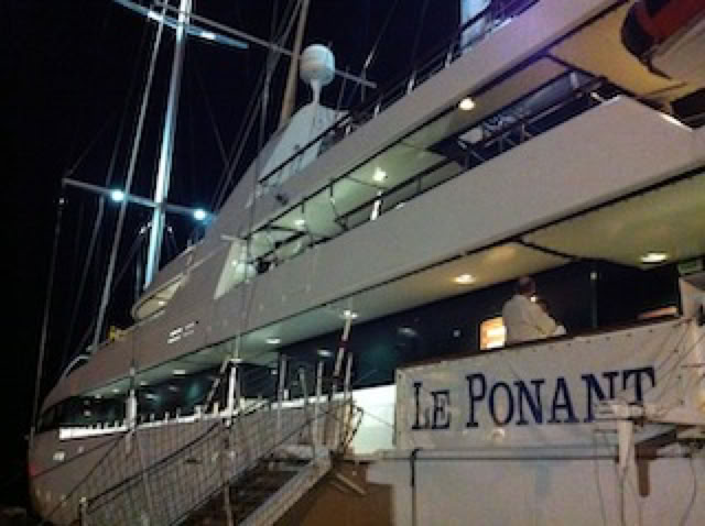 J’admire une dernière fois le Ponant à quai qui brille dans la nuit sous les lumières du quai.