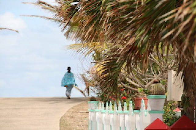 Nous choisissons d'aller voir la plage du Sud: vu la taille de l'île, c'est vite fait. Au passage nous admirons ... un cimetière dont les tombes sont couvertes de carrelage blanc et les allées bordées de gros coquillages type conques. Les maisons, elles, sont très colorées: ambiance Caraïbe avec les palmiers, les fleurs, etc.