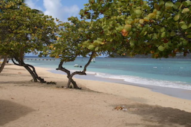 Nous ne prenons pas de taxi pour aller à St. John, la capitale, sans doute sans grand intérêt. Nous préférons nous diriger vers une petite plage magnifique: sable clair, arbres (?) bas pour se mettre à l'ombre, et l'eau claire pour se baigner. Mais avant d’y arriver, nous avons eu droit à une courte pluie tropicale.