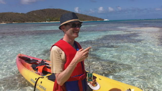 Nous empruntons ensuite, avec Fabienne et Charles, les deux canoë-kayaks amenés par le Ponant pour une balade autour de l’île. Le réglage du pagayage avant-arrière sur notre canoë n’est pas ... naturel : quelques problèmes de synchro ! Fabienne repère une grosse tortue de mer qui passe tranquillement devant nous.