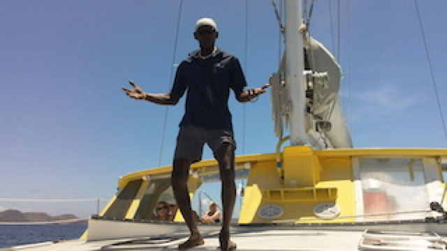 Navigation retour avec rhum-punch à volonté (sans excès pour moi). C’est toujours agréable de se reposer sur les filets du cata en regardant la mer d’un bleu magnifique défiler sous le bâteau. L'occasion aussi de voir des nuées de poissons volants : je n’imaginais pas que ceux-ci pouvaient voler au raz des vagues sur des dizaines de mètres. Pendant ce temps, le rasta Elvis fait le spectacle !
