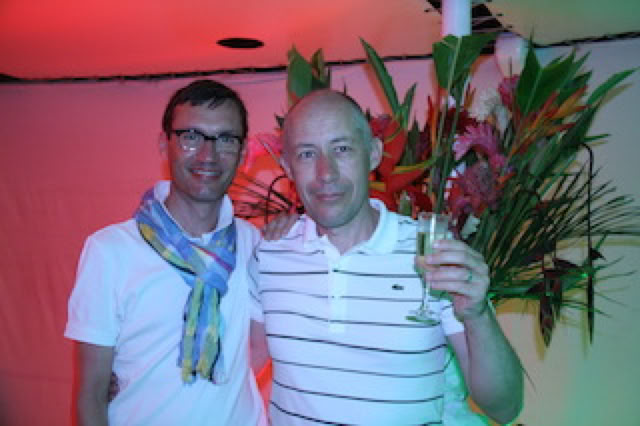 au restaurant Diamant suivi d’une "White party" sur le pont arrière Antigua. Pratiquement tout le monde à joué le jeu. Je suis moi même en pantalon blanc et polo blanc rayé Lacoste achetés spécialement pour la croisière.