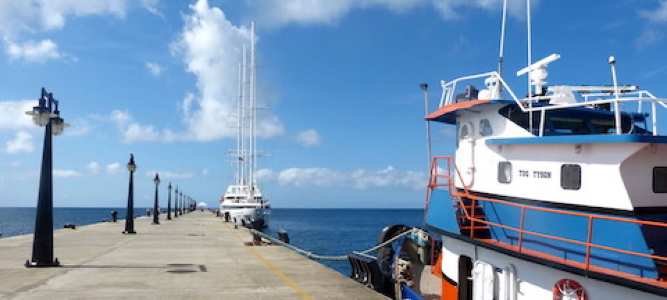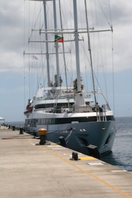 Atterrissage en douceur, débarquement et récupération rapide des bagages. Le bus nous attend pour rejoindre Le Ponant. Ce qu'on voit de Fort de France depuis le bus ne fait pas très envie: raffinerie, décharge, incinérateur ... Mais quand on arrive sur le port et qu'on aperçoit notre superbe bateau, tout change ! Avec ses trois immenses mats, il donne plus l'impression d'un grand yacht élancé que d'un bateau de croisière.