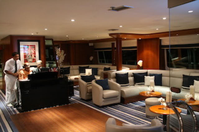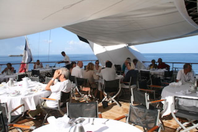 Sur le lit dans notre cabine, nous trouvons une invitation pour un cocktail privatif du commandant à 19h45 ... mais en fait c’est plus tôt (petite erreur sur l’invitation ...). Néanmoins, nous sommes, Pierre, Fabienne, Charles et moi installés devant la passerelle avec le commandant et Sarah: champagne, petits toasts au caviar et discussion intéressante avec le Commandant : un petit sentiment de privilège. Nous soupçonnons la remarquable prestation de Pierre la veille pendant la White Party d’être à l’origine de cette invitation par l’entremise de Sarah Happy