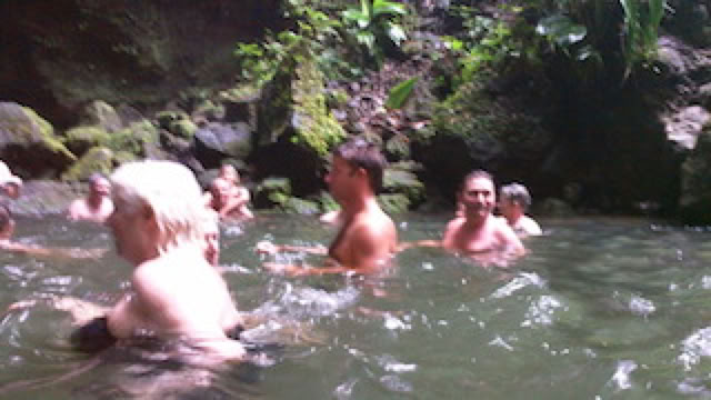 Nous arrivons sur le site de la "Emerald Pool", toujours sous des trombes d'eau. C'est donc déjà trempés, les uns avec la serviette bleue du Ponant sur la tête, les autres en maillot de bain, que nous nous engageons sur le sentier tropical qui conduit à la chute. La baignade elle même est assez folklorique sous la pluie. L'eau est relativement froide, mais c'est néanmoins un moment original de se baigner ainsi en pleine nature, sous une cascade et sous la pluie. Retour trempés au bus et arrivée à 13h30 sur le quai du Ponant ... sous un grand soleil. C'est vraiment la montagne qui accrochait les nuages !