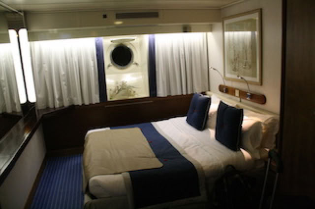 Sans nous occuper des bagages, nous sommes accueillis par l'équipage. Petite attente avec cocktail dans le grand salon, quelques explications et nous rejoignons nos cabines, la 29 qui sera notre chez nous pour une semaine. Jolie cabine, soigneusement préparée, accueillante, avec son hublot au raz de l’eau.