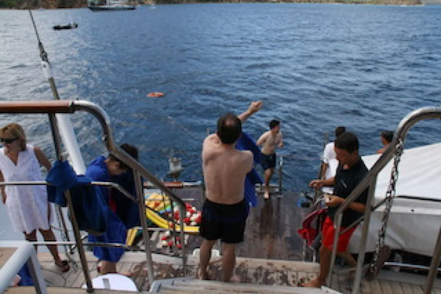 La météo ne permet pas de faire la baignade en pleine mer prévue, mais pour 'compenser' , le commandant organise une sortie en Zodiac pour admirer et photographier le Ponant sous voile. Et c'est vraiment un moment magique de voir, depuis la mer, ce magnifique navire blanc avec ses trois grands voiles et ses deux focs hissés, sous le soleil et sur une mer bleue turquoise. Après deux tours du bateau et une cinquantaine de photos plus tard, il faut remonter à bord, avec une bonne houle, sur la marina (la plage arrière du bateau).