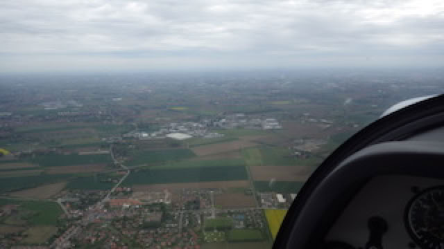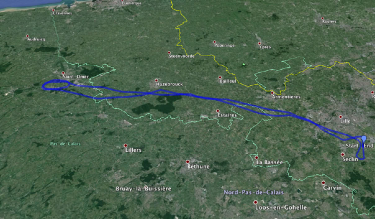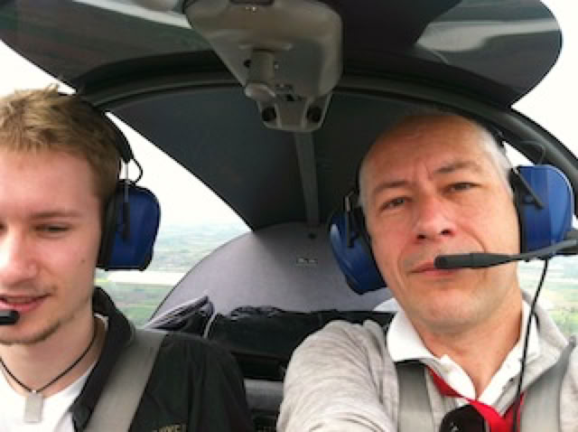 Le matin, j’avais aussi fait un tour en avion avec Matthieu : Lille - St Omer et retour, avec le F-GUXU. Nous n’étions pas loin de Cassel ! Sur la photo ci-dessous, je fais la grimace (c’est le soleil 😀 ), et Matthieu pilote.
