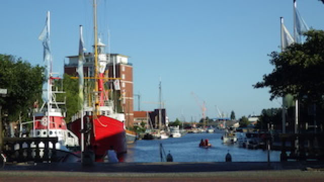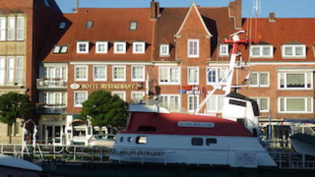 Arrivée à Pektum (!) et débarquement rapide. Joli point de vue avant de parcourir les derniers kilomètres vers Emden. Pierre trouve rapidement l’hôtel, le «Goldener Adler», tout contre la mairie d’Emden. Depuis la grande chambre, sous les toits (il fait chaud ...), on voit deux bateaux musée en face, dont un beau bateau phare.
