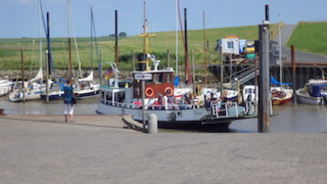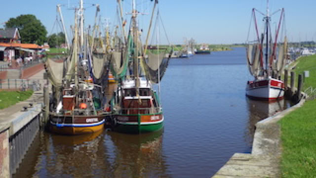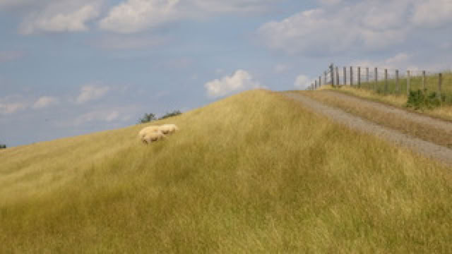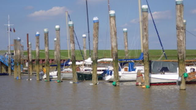 L’endroit est charmant avec ses nombreux bateaux de pêche au crabe et leurs grands filets en demi-lune, sa micro-librairie, ses maisons typiques ... Après avoir pris bu un «Léonardo» et acheté quelques «Brötchen» dans un tea-room, nous poursuivons notre route, vers Norddeich ... et toujours un long paysage de digue, juste interrompu par un grand troupeau de moutons. Petite pause à l’ombre pour manger les Brötchen à l’ombre d’un des rares bosquets du parcours.
