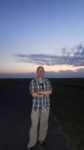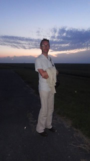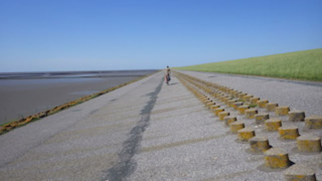 De là, nous allons faire des dizaines de kilomètres de digues, le plus souvent côté mer ... mais la mer est assez loin. Le paysage est à la fois très simple et magnifique par sa sobriété et sa régularité : la mer, la prairie, la bande cyclable, la digue recouverte d’herbre, et parfois des moutons. La plus longue ligne parfaitement droite fait 8 km ! Le tout sous un soleil intense. Je fais une grande consommation (1.5 l) du Coca Light que Pierre m’a acheté ... mais maintenant bien chaud !