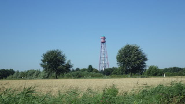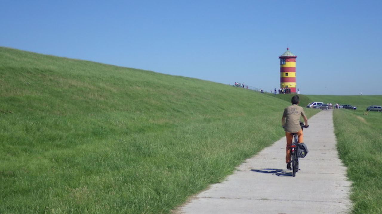 Nous passons d’abord par la «leuchturm» (phare) de Campen, à l’allure rigolote de robot. En face, au loin, la côte hollandaise, avec une énorme zone portuaire-insdustrielle et une forêt d’éoliennes.
