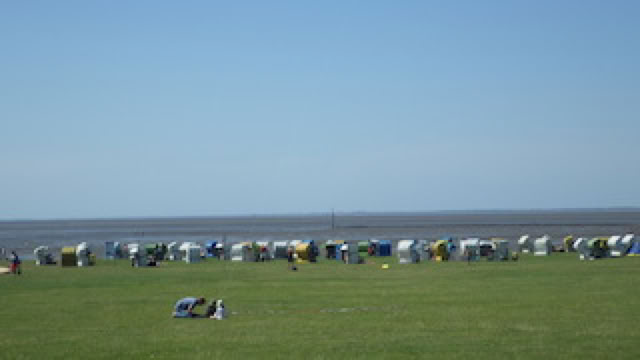 Arrivée à Norddeich, station balnéaire du Nord : problème, la mer est tellement loin que les très nombreux vacanciers se partagent entre: