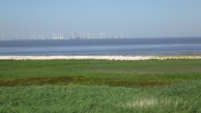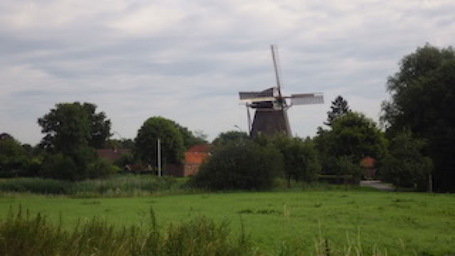 Pierre avait initialement prévu de repartir de Norden en train jusqu’à Emsdetten, mais nous voulons profiter encore un peu de la nature et nous ne sommes pas pressés : nous choisissons donc de retourner de Hage à Emden à vélo et de prendre le train à Emden. Nous prenons un chemin plus court que la veille, par l’intérieur. Par contre, nous avons le vent pratiquement de face sur le parcours et notre «vitesse sol», habituellement de 20 km/h, tombe souvent en dessous de 15 km/h, voire moins ... et avec beaucoup plus d’effort. Nous sommes essentiellement dans un paysage de polder, parsemé de nombreuses éoliennes.