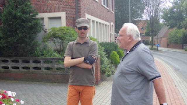 Afin de tester les vélos que nous utiliserons pour notre randonnée, Klaus nous emmène pour un tour à vélo autour d’Emsdetten. Nous commençons par la gare où Pierre achète les billets de train pour le lendemain. Certaines parties de la promenade ressemblent plus à du trial ... pas très adapté aux vélos de type hollandais que nous utilisons.