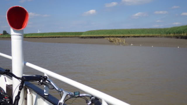 Nous prenons ensuite notre pause déjeuner à la boulangerie d’en face avec quelques Brötchen fromage, jambon, etc ... Il commence à faire très chaud et nous reprenons nos vélo pour rejoindre Ditzum pour y traverser l’Ems sur un bac. Encore de longues, très longues digues, des moutons (blancs ou noirs ...), et beaucoup de soleil.