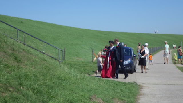 Passage à proximité du «Alten leuchturm» . Ce phare est lui-aussi rigolo avec ses bandes jaunes et rouges. Visiblement, il s’agit d’un endroit romantique, avec ses nombreux cadenas attachés aux fenêtres, des graphitis amoureux ... Deux mariages sont venus prendre des photos à cet endroit, dont une impressionnante mariée japonaise dans une belle robe rouge : c’est un peu décalé vu l’endroit mais ça vaut la photo 😀
