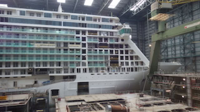 La visite guidée commence par différentes salles d’exposition qui expliquent les origines du chantier, les types de navires construits ici, etc ... Néanmoins, évidemment, ce qu’on attend le plus, c’est de voir le hall de construction, et nous ne sommes pas déçus tant ce hall est spectaculaire : par chance, un paquebot de presque 400m de long se termine. C’est stupéfiant de le voir ainsi dans ce bâtiment fermé. On apprécie aussi le système de cabines préfabriquées qui sont ensuite glissées de part et d’autre du paquebot comme des boites à chaussures !