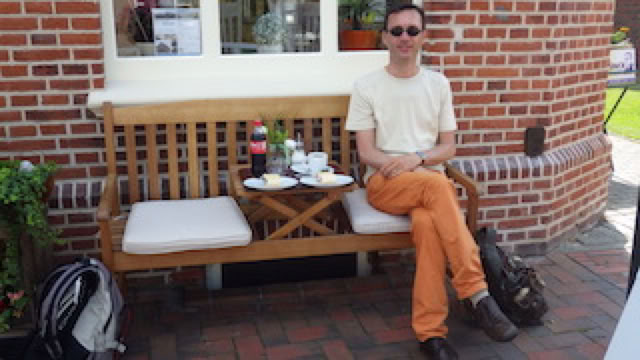 Arrivée à Ditzum après 15h : en attendant le bac («Fähre» 😀 de 16h, nous prenons une petite patisserie avec un Coca en terrasse d’un joli salon de thé.