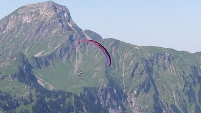 Je pratique l’avion, mais ce n’est pas comparable : c’est vraiment la sensation de voler comme un oiseau, exactement comme dans mes rêves (Xavier aura la même sensation). Après plusieurs cercles pour prendre une ascendance et remonter un peu, Christophe me fait pleinement profiter du paysage et du vol. Mais comme j’ai parlé au moniteur de mon activité aéronautique, celui-ci me propose de faire quelques ‘virages’ ... et là, c’est beaucoup plus violent : gauche, droite, gauche, droite, au moins 2g, plongée puis remontée vers le ciel bleu jusqu’à ce que la voile perde sa vitesse avant de replonger ! C’est à la fois éprouvant et extraordinaire de sensations. L’approche est plus tranquille et permet d’admirer Châtel vu d’en haut, y compris le chalet Madeline. Après plusieurs virages tranquilles pour perdre l’altitude et viser le champ d’arrivée au centre de Châtel, nous touchons le sol comme une fleur : juste debout, sans besoin de courir !