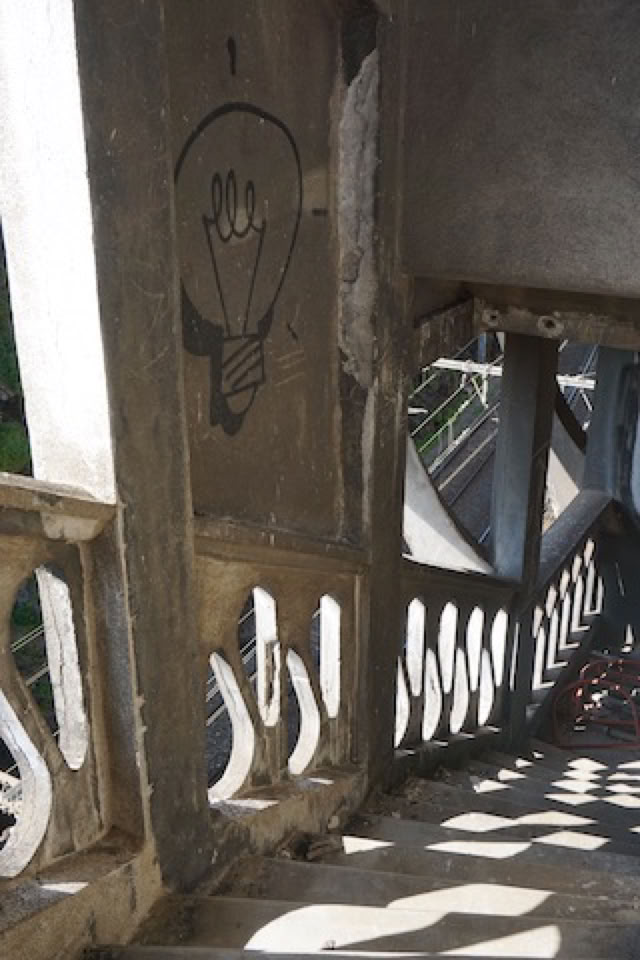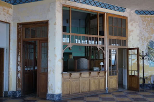 En tournant autour (pour les photos) et en se disant qu’on ne voudrait se risquer dans ce bâtiment vu l’état apparent de fragilité du béton ... le gardien des lieux nous propose de nous joindre à un petit groupe pour une visite assurée ... par la concierge. En fait, l’endroit n’est pas totalement abandonné, il y a même une dizaine de petits appartements de vacances rénovés au dernier étage. Le propriétaire privé réalise une rénovation ... très, très progressive, à notre avis très insuffisante et pas très fidèle à l’esprit des lieux. Mais bon ...