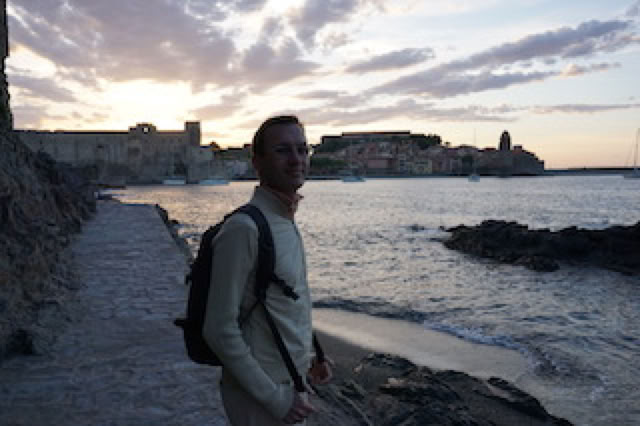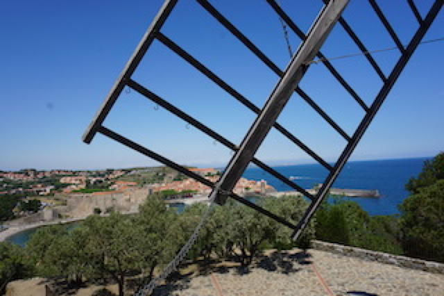 Aujourd’hui, ce sera la mer et le Sud jusqu’à la frontière espagnole. Direction Collioure pour commencer. On y arrive vers 11h, un peu avant la foule. On se gare sur le parking près du Fort Carré et on en profite pour une première ballade face à la belle Méditerranée, en haut des falaises. Nous descendons ensuite vers le port (zut, il faudra remonter tout ça !) : c’est vraiment un très bel endroit, très touristique aussi. Nous prenons notre temps pour flaner, faire le tour du port, aller sur la jetée, etc. Mais nous ne reculons jamais devant une petite rando improvisée (avec quand même de l’eau cette fois), nous montons d’abord au moulin qui domine le port. L’endroit est calme et nous faisons une pause sur un mur de pierres sèches, sous les oliviers.