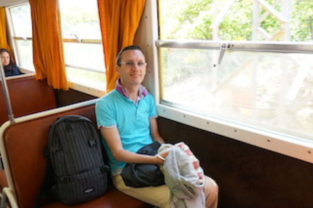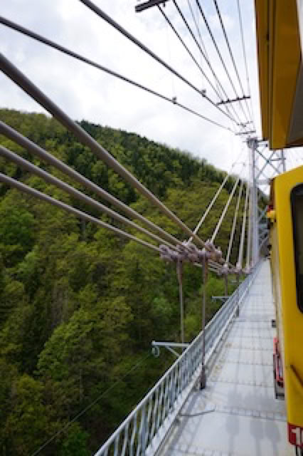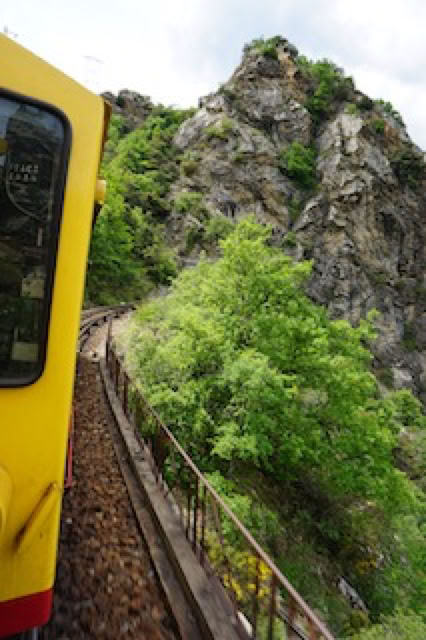 C’est parti. On s’installe dans la deuxième voiture qui à l’avantage d’avoir une plate-forme extérieure à chaque extrémité. Le train commence sa tranquille ascension : c’est une succession de gorges, de petits tunnels, de quelques ponts et viaducs. L’occasion d’avoir un point de vue original sur le paysage. C’est par endroit un peu vertigineux, ça fait du bruit et ça secoue un peu. Pour des raisons d’horaire, nous décidons finalement de nous arrêter à Mont Louis, avant Font Romeu.