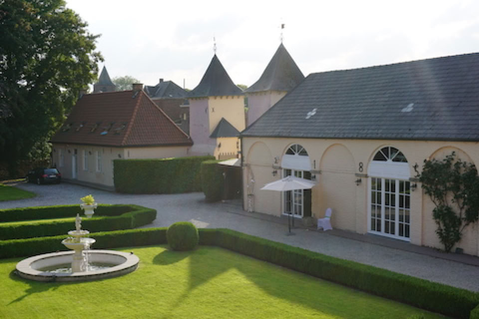 Arrivée à Arc-Wattripont, au Château Bagatelle : le cadre est idéal, avec une belle cour «à la française» bordée par le chateau, son donjon et ses dépendances. Et les enfants ont leur propre château ... gonflable. Le vin d’honneur a donc lieu dans ce bel endroit sous un soleil qui peut tourner à l’orage ... Il fait vraiment très chaud pour un 7 juin.