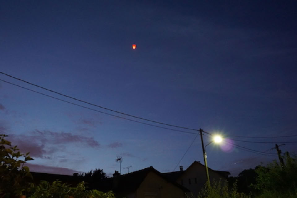 Petite pause avec un grandiose lâcher de lanternes de papier lumineuses que nous avons vu s’éloigner et monter jusqu’au ciel avec un émerveillement partagé. A priori, aucune chute d’avion n’a été signalée dans l’axe d’Orly cette nuit là !