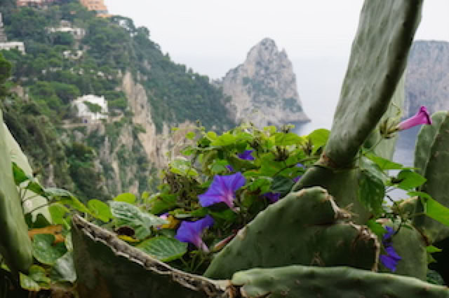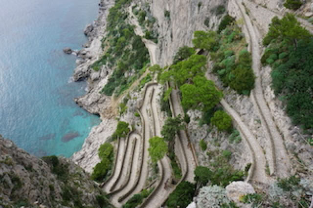 Débarquement rapide à Marina Grande et nous fonçons vers le funiculaire qui nous montera jusque sur la place de Capri. Joli point de vue, quelques boutiques et hôtels de luxe tout autour. Les guides conseillent la "Via Krupp", le plus beau sentier du monde. Malheureusement, celui-ci est fermé pour cause d'éboulements et nous nous rabattons sur le joli parc adjacent, le "Giardina d'Augusto" qui offre (moyennant 1&euroWinking une vue spectaculaire sur la baie, les falaises … et la Via Krupp vue d'en haut.