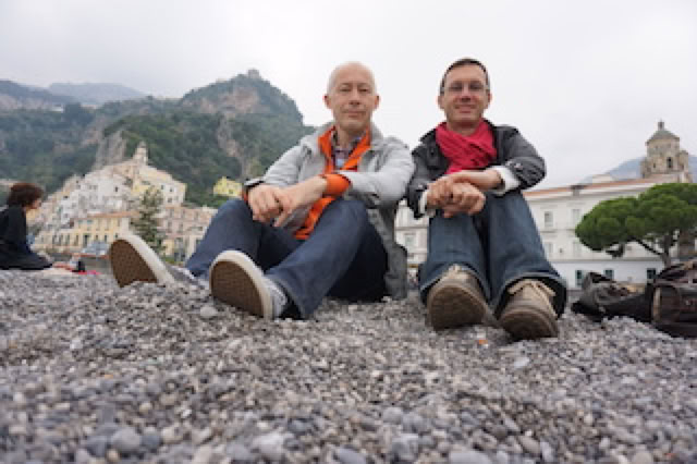 Vers 13h, nous reprenons donc la route, direction "Santa Agata Sui Due Golfi" … que nous ne trouverons jamais ! Et d'erreur de direction en erreur de direction, de route barrée (ou prétendue telle) en guidage GPS hasardeux sur de minuscules routes, nous revenons sur nos pas du côté de Sorrento et sommes embarqués sur la route vers Naples, à l'opposée de notre objectif. Et c'est donc après des dizaines de kilomètres, des milliers de virage, que nous arrivons au sud de la péninsule. Il faut encore traverser plusieurs petites villes, Agerola, Furore, etc. pour arriver enfin et fourbus à Amalfi. L'endroit est beau mais très touristique. Pour nous remettre d'aplomb, nous prenons donc un café et une part de gâteau face à la cathédrale (oups, encore 18€, le gâteau passe mal !). Nous allons sur la plage de gros graviers ronds, où quelques personnes se baignent : il est vrai que l'eau n'est pas froide et je regrette amèrement de ne pas avoir mon maillot de bain pour me baigner un 13 novembre. Néanmoins, on profite de l'ambiance tranquille, des barques qui glissent sur la mer d'huile. Après une heure à Amalfi, nous prenons la route pour monter à Ravello.