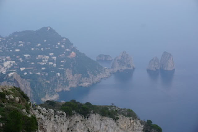 Les guides conseillent aussi Anacapri, au dessus de Capri, qui permet ensuite d'accéder au "Monte Solaro" via un télésiège. C'est donc avec un petit bus public orange que nous montons à Anacapri, par une route sinueuse et très spectaculaire, voire vertigineuse. Il est déjà 13h30 et nous avons une petite faim. Nous trouvons une excellente part de pizza à emporter que nous mangeons sur un banc suivi d'un café en terrasse. Puis nous trouvons le fameux télésiège … monoplace ! Nous prenons un A/R avant d'embarquer sur ces "chaises suspendues" : un peu impressionnant, mais somme toute, ce n'est qu'un télésiège. En haut, peu de monde, à part toute une famille indienne un peu bruyante. La vue est magnifique, les falaises vraiment vertigineuses … et le soleil fait une opportune apparition et fait enfin scintiller la Méditerranée. Après quelques selfies, Pierre se demande si on ne pourrait pas descendre à pied … mais avec un dernier bateau à 16h30, il ne faut pas se louper. Renseignement pris, on prend donc à pied le chemin de la descente (tant pis pour les billets retour du télésiège). C'est finalement très simple et permet de profiter un peu du paysage et de la nature environnante.