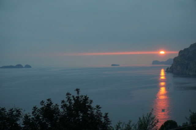 Quelques centaines de virage plus loin, nous arrivons à Positano alors que le jour tombe. Le plan de circulation fait qu'on parcourt toute la ville de haut en bas puis de bas en haut sans demi-tour possible … et comme Pierre fait un peu le difficile pour le parking Happy nous ressortons de la ville par la route où nous sommes arrivés ! Mais là, j'aperçois un magnifique couché de soleil : je gare la Fiat "à l'arrache" pour prendre quelques belles photos du soleil rouge qui se reflète sur la mer. Nous garons un peu mieux la voiture et partons faire un tour dans la ville. L'endroit est charmant, et depuis la plage, la vue de toutes ces maisons et hôtels colorés accrochés à la montagne est très typique de cette côte amalfitaine. Quand les dernières lueurs ont disparu à l'horizon, nous reprenons la voiture.