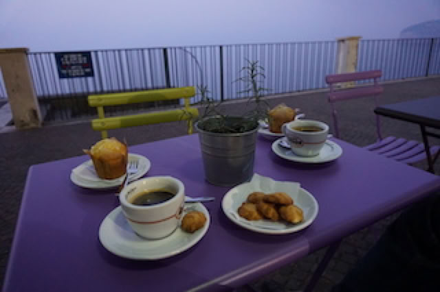 Très bel hôtel, accueil soigné, bagagiste et voiturier, la classe ! Nous bénéficions d'un "surclassement" avec une grande chambre en façade. Et s'il n'y a pas de vue sur mer, nous avons néanmoins la vue sur les jardins avec les fontaines et les citronniers. Quelques photos de la chambre et nous décidons d'aller découvrir les alentours. Il fait bon. Nous découvrons vite que la ville est en surplomb de falaise. Belle vue, bien qu'un peu brumeuse. Nous descendons par la route et quelques escaliers au niveau du port pour nous promener au bord de l'eau et voir la ville depuis le pied de la falaise. Pierre remarque un escalier à flanc de falaise pour remonter en ville. Nous suivons l'étroit passage, un peu inquiétant car il commence à faire sombre, puis empruntons l'escalier. On se demande vraiment s'il mène jusqu'en haut car à mi-hauteur, l'escalier rentre dans la falaise dans une sorte de grotte bien sombre … En fait, c'est bien le chemin et l'escalier ressort plus haut et nous amène sur une jolie petite esplanade. Nous nous installons en terrasse d'un café, face à la mer pour profiter des dernières lueurs de la journée. Un bon café et un muffin plus tard (et 19€ !!!), nous rentrons nous reposer à l'hôtel.