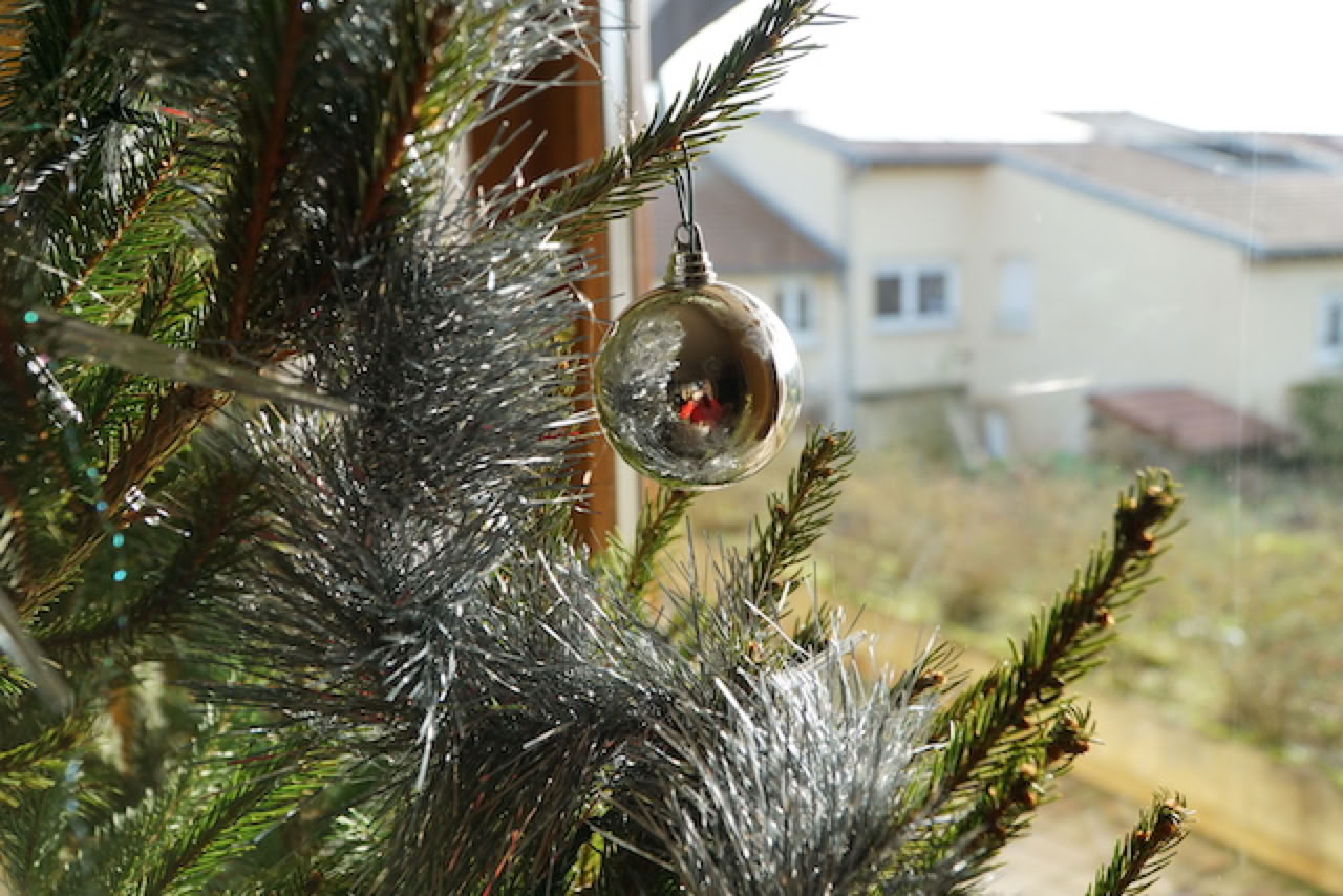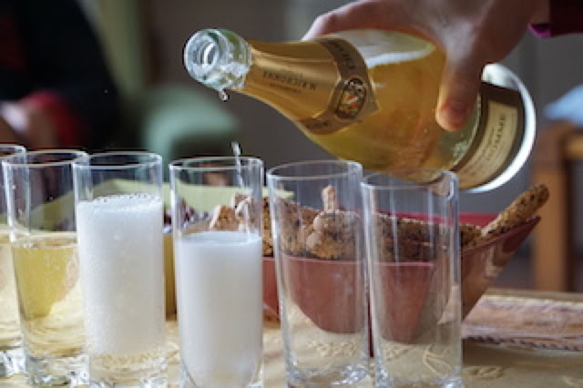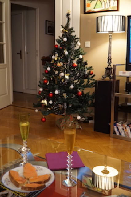 Noël à deux à Courbevoie. Petit apéritif au Champagne et saumon. Repas simple avec pavé de saumon au gratin et une bûche glacée.