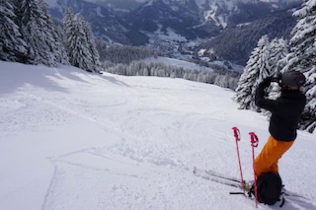 Retour quand même par Super Châtel, la liaison fonctionne à nouveau. Beaucoup de plaisir sur la piste bleue qui longe la rouge des Combes : large, personne, neige extraordinaire ! Puis descente par le chemin jusqu'à Chatel.