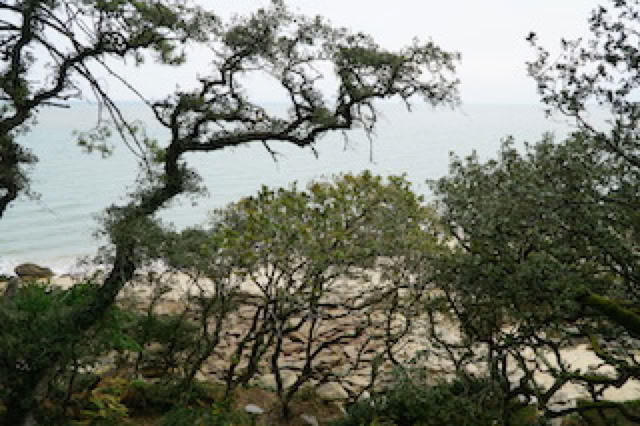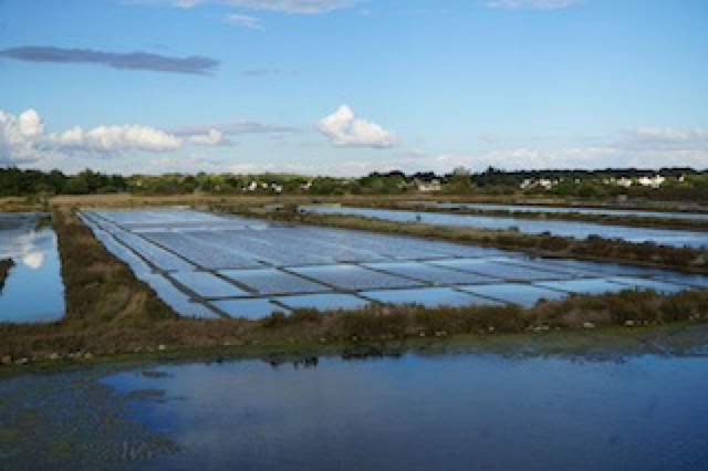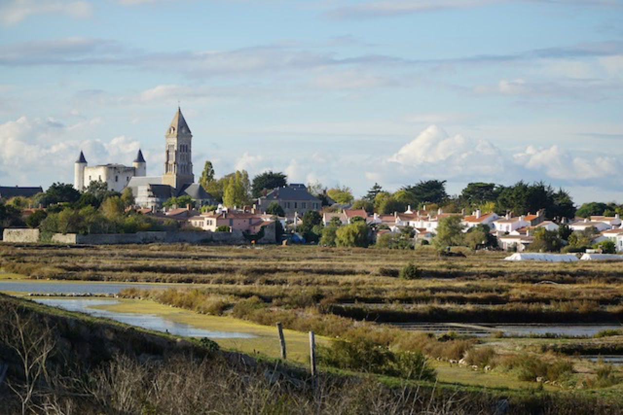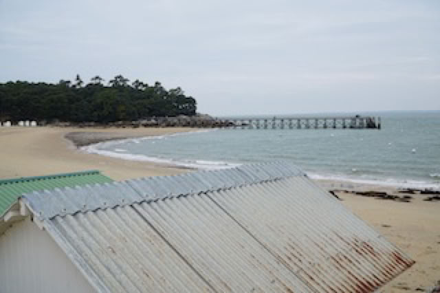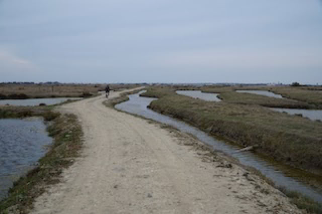 Le matin, boucle dans le Nord de l’île : d’abord le long de la jetée Jacobsen jusqu’à la pointe nord, pour la route qui longe la côte Est jusqu’au bois de la Chaise (ou Chaize). A intervalle régulier, une allée permet d’aller jusqu’au bord de mer, avec à chaque fois un point de vue différent, une belle plage ou un petit coin tranquille. C’est aussi la découverte de belles maisons cachées dans cette forêt ou bien bordant la plage. Une maison en particulier ferait bien notre affaire et nous fait penser à celle que nous louons habituellement à Arcachon: étroite avec un garage en rez-de-chaussée et un escalier latéral, sur un beau terrain … On peut rêver … Un peu plus loin, c’est un joli village blanc, Le Grand Vieil, avec des maisons basses aux tuiles rondes et aux volets bleus. Petite pause pour acheter du ... dentifrice dans un Spar, et pour prendre un café et se réchauffer un peu. Nous poursuivons la route, avec une pause dans un joli cimetière marin du lieu-dit de l’Herbaudière. Nous terminons la boucle Nord en longeant les marais salants. Distance totale : 20 km.